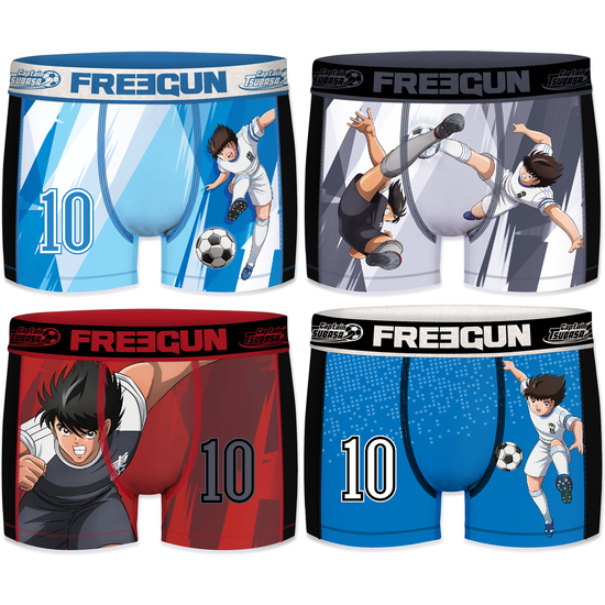 Conjunto de 4 peças de cuecas boxer impressas da coleção Captain Tsubasa – Campeões: Oliver e Benji – Super Campeões – os famosos desenhos animados de futebol, das intrépidas aventuras de Tsubasa Ozora/Oliver Atom, Genzo Wakabayashi/Benji Price, Kojiro Hyuga/Mark Lenders/Steve Hyuga , Taro Misaki/Tom Baker/Tom Misaki…